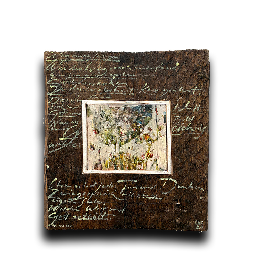 Mit einem Gedicht von J.W. Goethe. Ölfarbe auf Holzmalfläche, eingepasst und im Holzblock 29x32 cm verleimt, Tiefe 5 cm. | Eine Arbeit von 2022