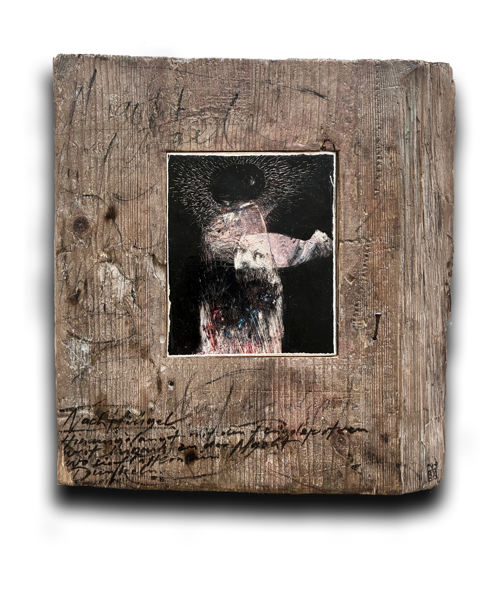 Mit einem Gedicht von M. Kaléko. Ölfarbe auf Holzmalfläche, eingepasst und im Holzblock 27x30,5 cm verleimt, Tiefe 5 cm. | 2025