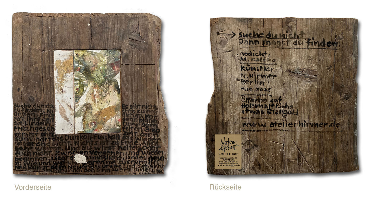 Arbeiten in Verbindung von klassischer Ölmalerei mit teilweiser Blattgoldunterlegung auf Holzmalfläche 11x16 cm. Eingebettet in ein Passepartout 30x40 cm, schaffe ich einen Raum für eine malerische und eine poetische Ebene. Es gibt verschiedene Themen, wie die 4 Jahreszeiten, Faces, Bäume, Traumbilder und die Verbindung mit Gedichten von Hermann Hesse, Eva Strittmatter, Mascha Kaléko, G. Trakl ua.